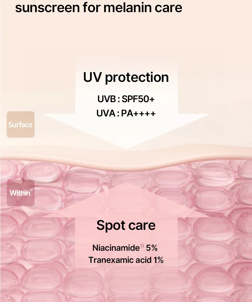 Αυτό το αντηλιακό περιέχει χημικά φίλτρα UVA και είναι εξοπλισμένο με SPF50+ PA++++ για την προστασία του δέρματος από τις βλαβερές ακτίνες UV. Είναι εμπλουτισμένο με τρανεξαμικό οξύ και νιασιναμίδη για την αντιμετώπιση της υπερμελάγχρωσης και του ανομοιόμορφου τόνου του δέρματος, καθώς και με πανθενόλη για την αποφυγή εξάρσεων. Η ελαφριά σύνθεσή του απορροφάται γρήγορα από το δέρμα για ένα μη λιπαρό φινίρισμα χωρίς λευκά σημάδια.
