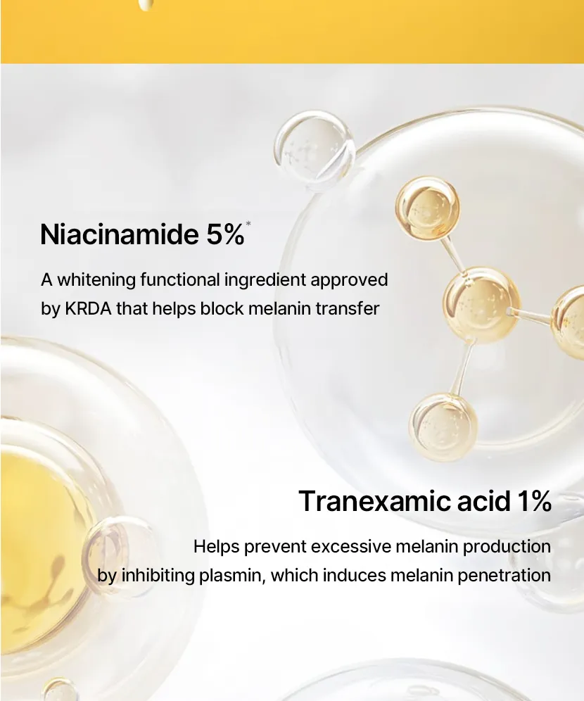 - Με σύνθεση με τρανεξαμικό οξύ, νιασιναμίδη και πανθενόλη που βοηθούν στην πρόληψη της παραγωγής υπερβολικής μελανίνης για την πρόληψη της εμφάνισης σκούρων κηλίδων.