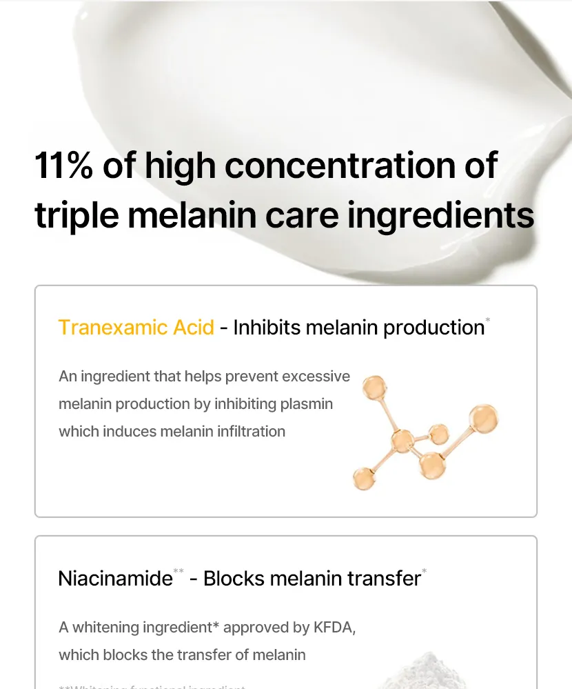 Με ισχυρά φωτεινιστικά συστατικά όπως το τρανεξαμικό οξύ, η νιασιναμίδη και το Melazero V2, αυτή η κρέμα αναστέλλει την παραγωγή μελανίνης για να μειώσει τις σκούρες κηλίδες και να ομοιομορφίσει τον τόνο της επιδερμίδας. Το Ceramide NP και το υδρολυμένο υαλουρονικό οξύ προσφέρουν βαθιά ενυδάτωση και ενίσχυση του δερματικού φραγμού.