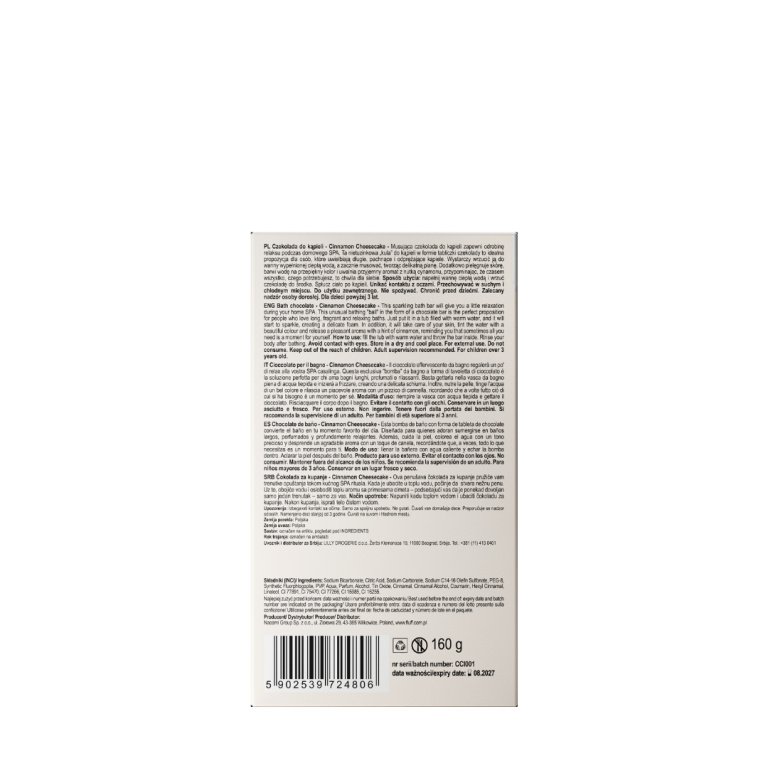 Το Fluff Chocolate Bar Bath Bomb Cinnamon Cheesecake (160g) είναι ένα λαχταριστό bath bomb σε μορφή σοκολάτας, με ζεστό άρωμα κανέλας και κρεμώδους cheesecake. Λιώνει στο νερό δημιουργώντας αφρό, γλυκιά ατμόσφαιρα και απαλή ενυδάτωση στο δέρμα. Ιδανικό για μια cozy, χαλαρωτική εμπειρία μπάνιου.
