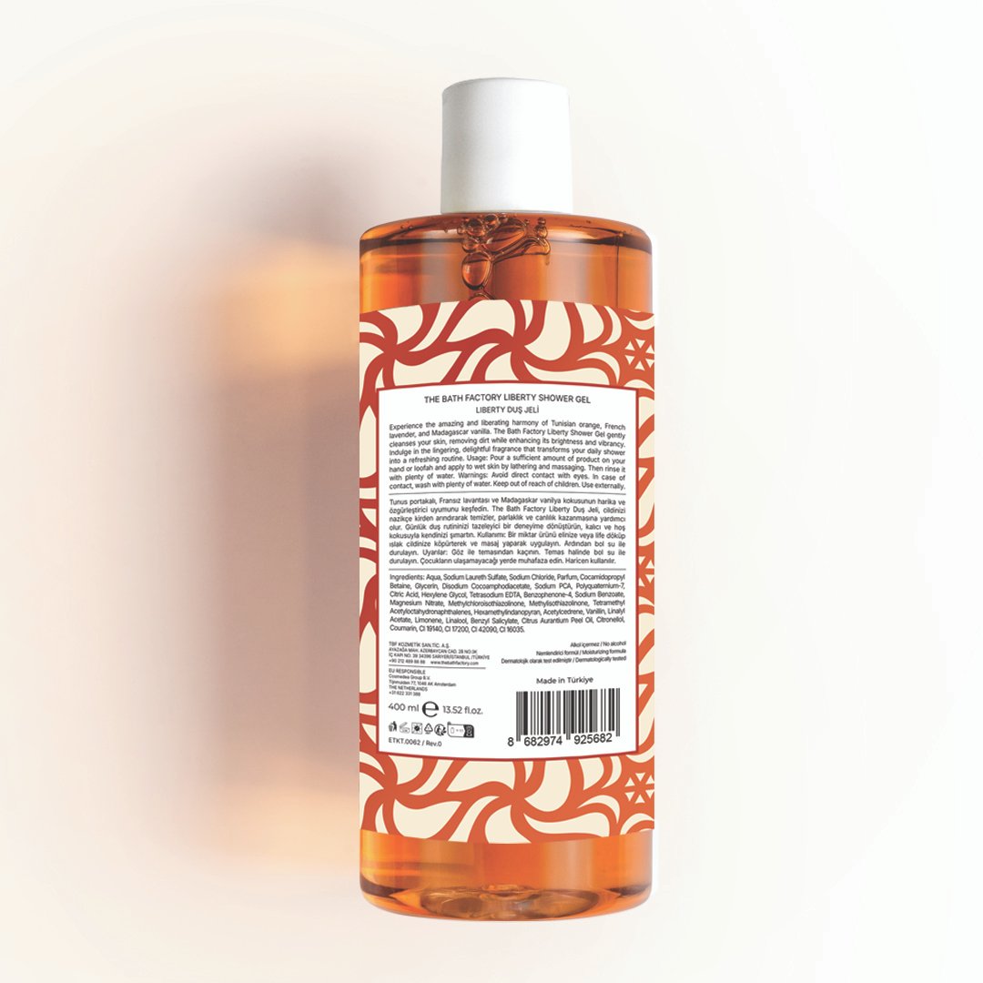 Ανακαλύψτε την υπέροχη και απελευθερωτική αρμονία του τυνησιακού πορτοκαλιού, της γαλλικής λεβάντας και της βανίλιας Μαδαγασκάρης με το Liberty Shower Gel από τη The Bath Factory! Αυτό το απαλό αφρόλουτρο καθαρίζει την επιδερμίδα απομακρύνοντας τις ακαθαρσίες, ενώ ενισχύει τη λάμψη και τη ζωντάνια της. Απολαύστε το μαγευτικό άρωμα που μετατρέπει κάθε ντους σε ένα αναζωογονητικό και γεμάτο φρεσκάδα τελετουργικό.